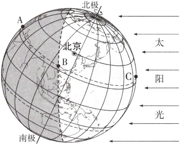 (2)在北回归线上A、B、C三点中,刚好日出的是