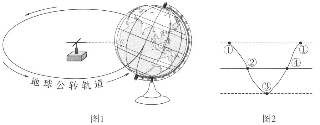 图1为地球公转演示图(支架顶部的十字架代表太阳光线),图2为太阳直射点移动路线图。读图,完成9~10题。