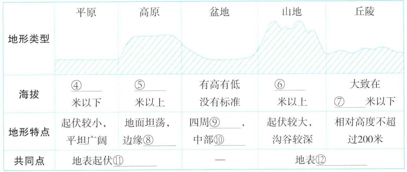 |起伏较大,沟谷较深|相对高度不超过200米||共同点|地表起伏⑪