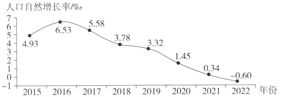 据国家统计局公布数据,2022年我国人口比2021年减少85万人,人口自然增长率为-0.60‰,这是我国人口自1962年以来第一次出现负增长,同时进入老年人口高速增长时期。读2015~2022年我国人口自然增长率变化状况示意图,完成8~10题。