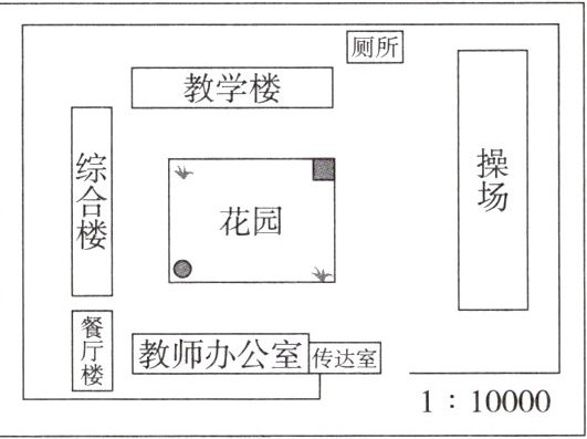 2. 如果教学楼东、西两侧图上距离为2厘米,则教学楼实际长度约为(
