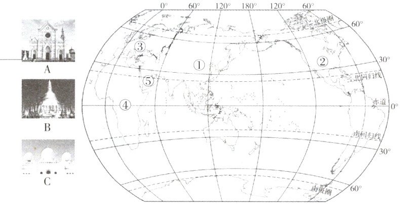 教。A、B、C三幅图中,主要分布在⑤地的宗教建筑物是C