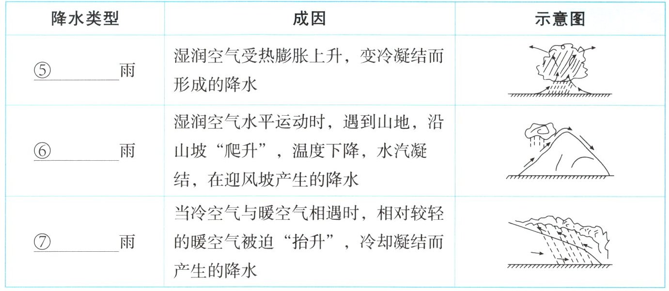 雨|湿润空气水平运动时,遇到山地,沿山坡“爬升”,温度下降,水汽凝结,在迎风坡产生的降水|||⑦