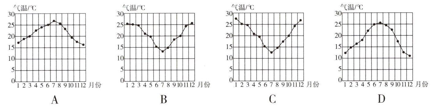 5. 四位同学根据下表数据分别绘制了一幅气温年变化曲线图,其中最准确的是(