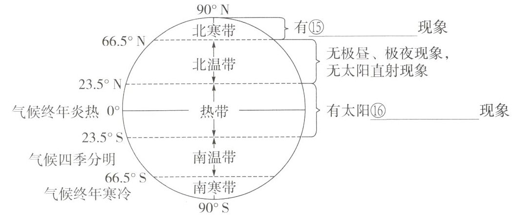 ⑥最强;⑦公转轨道;⑧南北回归线;⑨夏至日;⑩冬至日;⑪温带;⑫直射;⑬极昼;⑭极夜;⑮极昼极夜;⑯直射