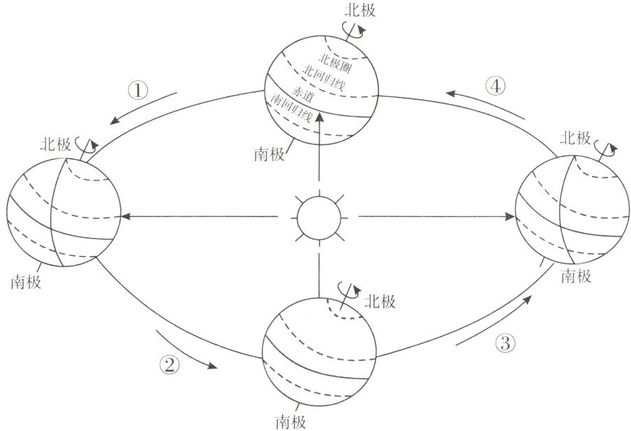 8. 每天正午时刻,学校操场前旗杆的影子有长有短,当广东某学校旗杆影子达到最长时,地球公转位置大致在图中的(