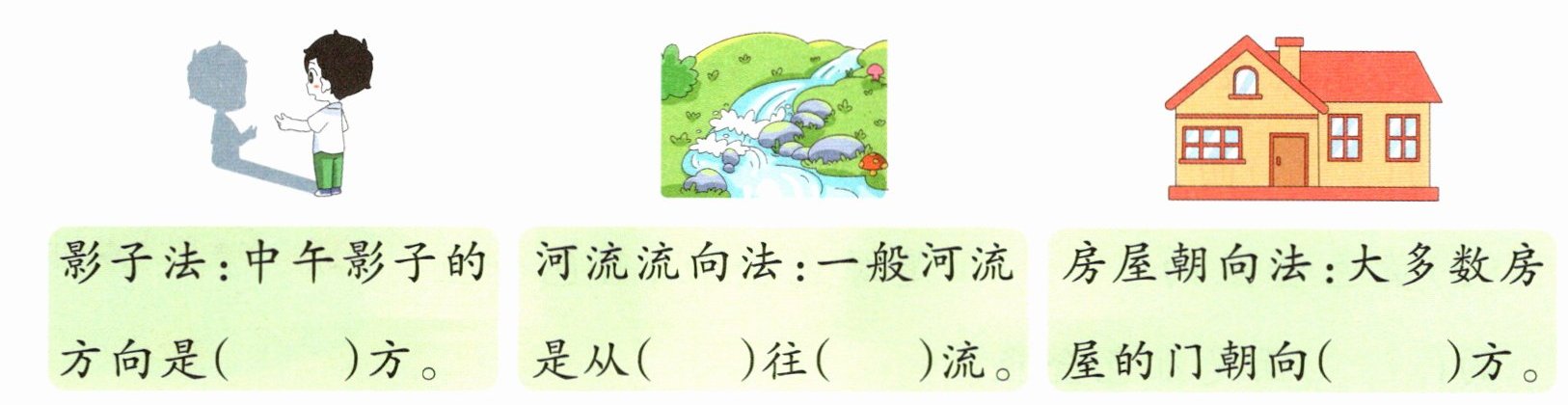 4.北 西 东 南 解析:中午太阳在南面,影子的方向是北方;由于我国地势西高东低,所以大多数河流都是自西向东流;大多数房屋的门朝向南方。