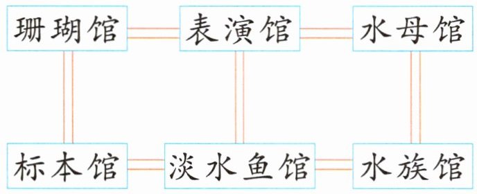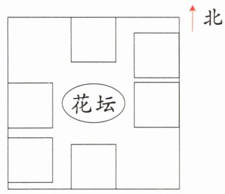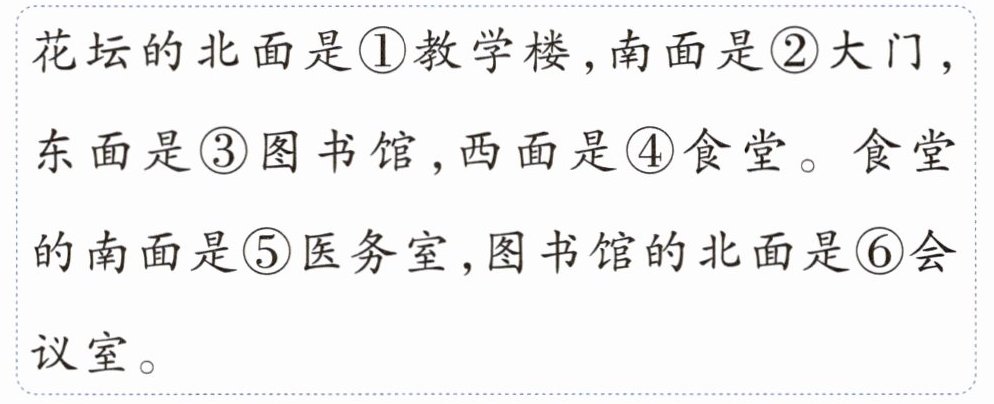 花坛的北面是①教学楼,南面是②大门,东面是③图书馆,西面是④食堂。食堂的南面是⑤医务室,图书馆的北面是⑥会议室。