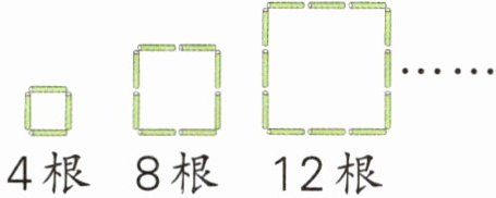 解析:第1个图形有4根小棒,第2个图形有8根小棒,第3个图形有12根小棒,因此小棒根数的规律是:第几个图形,就有4×几根小棒。第4个图形就有4×4=16(根)小棒,第5个图形就有4×5=20(根)小棒。