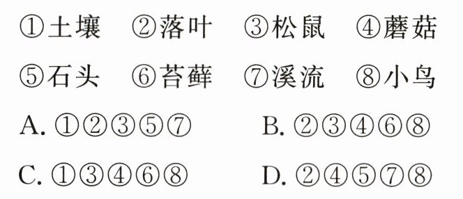 9. 你对自然科学感兴趣吗?我们生活的世界因自然万物而丰富多彩。下面是在某片小森林中发现的事物,请选出全部属于生物的一项( )