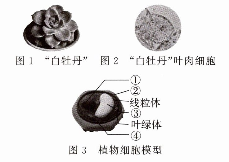 20. 如图1是被称为“白牡丹”的一种景天科多肉植物,图2是在显微镜下观察到的“白牡丹”叶肉细胞,图3是用彩泥制作的植物细胞模型,请回答问题。