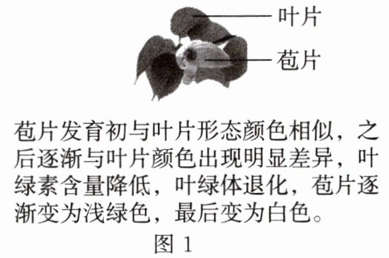 苞片发育初与叶片形态颜色相似,之后逐渐与叶片颜色出现明显差异,叶绿素含量降低,叶绿体退化,苞片逐渐变为浅绿色,最后变为白色。