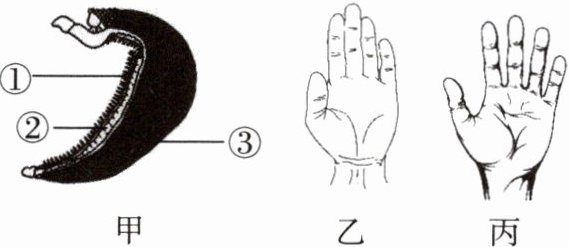 (填图甲中序号)至关重要。(6)通过仔细观察小林发现手指并拢和分开时的状态与鱼鳃中