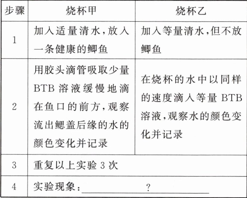 。(3)请预测上表中“?”处的实验现象:烧杯甲中,流出鱼鳃盖后缘的水呈