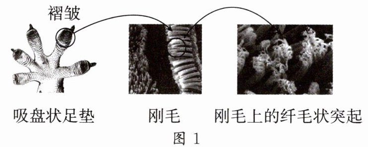 资料一:通常所称的壁虎属于吸爬型壁虎。这类壁虎的爪较小,其末端扩展形成吸盘状的足垫。这个吸盘由许多毫米级的褶皱组成。在显微镜下可以发现这些褶皱由数百万被称为刚毛的细小毛发状结构组成,刚毛尖端又有许多更细小的纤毛状突起(如图1),这样独特的结构使得此类壁虎能够抓附在物体表面的细小突起上攀爬移动,甚至在垂直的墙壁或玻璃表面也能稳定附着。