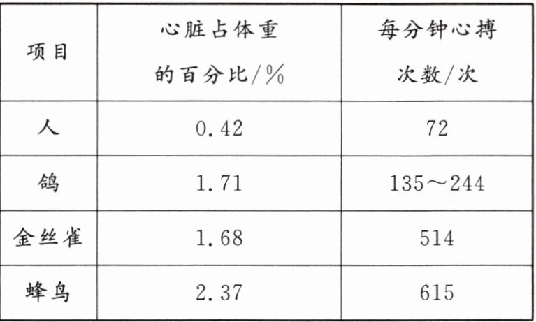 (6)通过比较资料二d表格中的数据可知,鸟的心脏占体重的百分比比人类,每分钟心搏次数更,其血液循环系统输送营养物质的能力更。