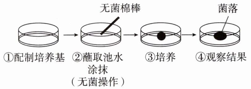 )①配制培养基 ②蘸取池水涂抹(无菌操作) ③培养 ④观察结果