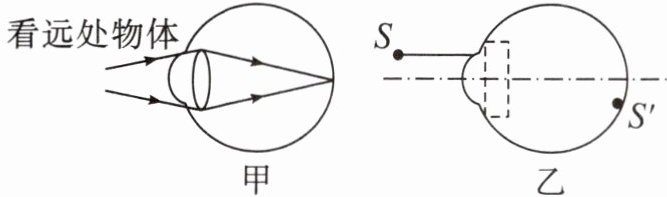 21. 如图甲为眼睛看远处物体时晶状体的形状,如改看近处物体 $ S $,眼睛会通过睫状肌来改变晶状体的薄厚,仍使像成在视网膜 $ S^{\prime} $ 处,请在图乙虚线框中画出看近处物体 $ S $ 时,晶状体的大致形状,并确定晶状体右侧焦点 $ F $ 的位置。