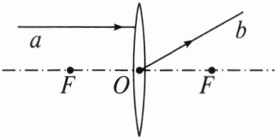 16. 如图所示,$ O $ 点为凸透镜的光心,$ F $ 点为凸透镜的焦点,光线 $ a $ 与凸透镜的主光轴平行,光线 $ b $ 通过凸透镜的光心。请在图中画出光线 $ a $ 的折射光线和光线 $ b $ 的入射光线。
