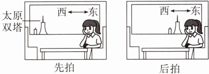 32. 小丽在朋友圈分享了自己外出旅行时的照片,其中两张是小丽坐在平直行驶的车内连续拍摄的照片,如图所示。网友判断小丽乘坐的车正在向东行驶。请你分析网友的判断是______(选填“正确”或“错误”)的,理由是______。