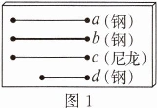 ★★12. 在探究“声音的三个特征”的活动中,同学们利用一些长短、粗细、材料不同的琴弦,他们选用的琴弦长度、粗细、材料在图 1 中已标出,并且每根琴弦固定在“音箱”上的松紧程度一致。
