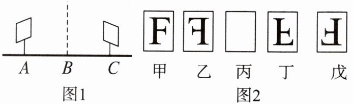 18. 某小组探究平面镜和凸透镜成像的特点,将光源和光屏分别竖直放置在水平光具座上的$A$、$C$位置,$B是AC$的中点,如图1所示。在$AB之间朝向A$观察,看到的光源形状如图2中甲所示。