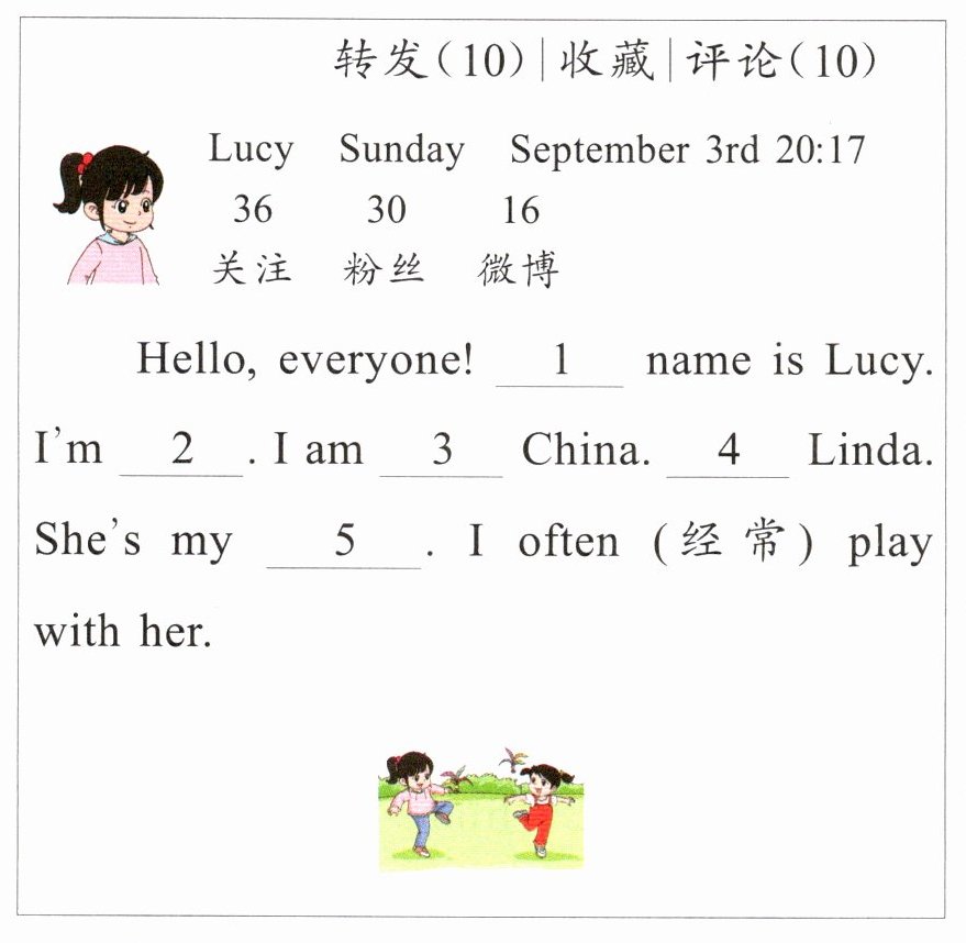 九 Lucy 认识了一位新朋友,她发了一条微博,但是漏掉了一些单词,认真读一读,帮 Lucy 补全这条微博吧。