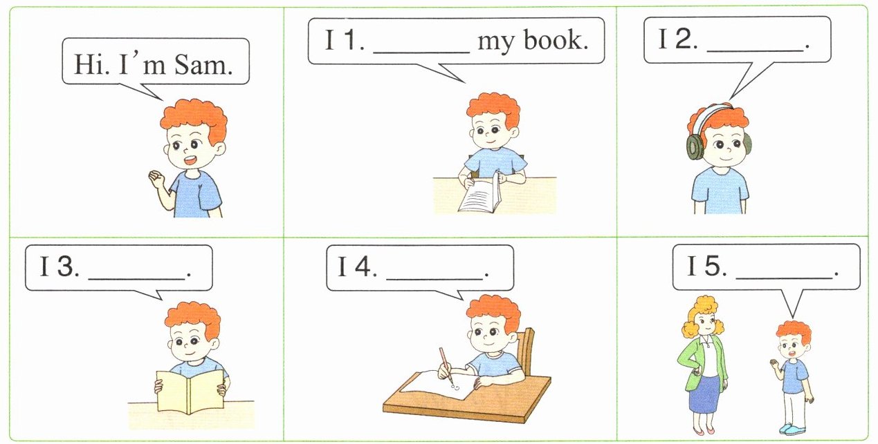 四 来看看 Sam 在家是如何学习英语的吧!看图,选择正确的单词补全句子。