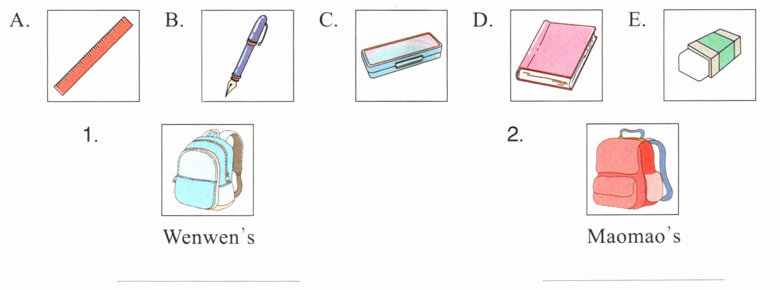 Hello, I'm Doudou. I have 2 friends. They are Wenwen and Maomao. Look at Wenwen's schoolbag. She has (有) no pencil case. She has a pen, a ruler and a book. This is Maomao's schoolbag. She has a pencil case, an eraser, a book and a ruler in it.