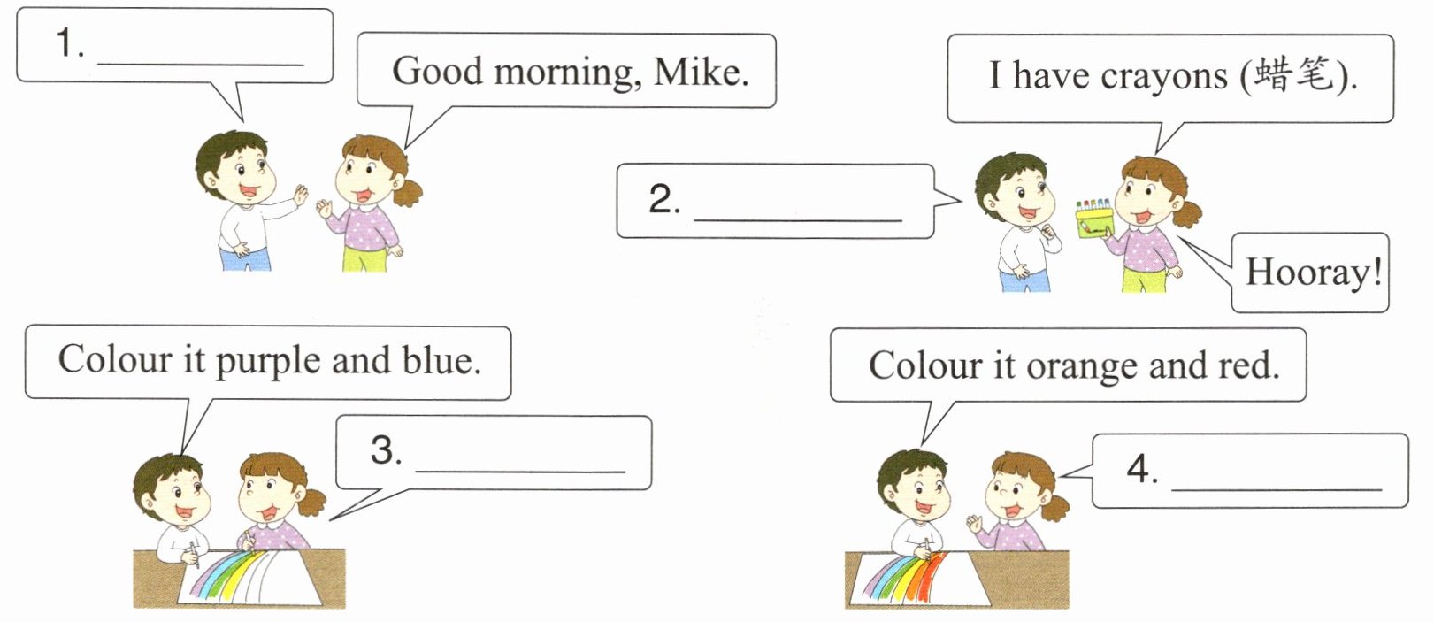 小黄、小红和小蓝外出去游玩,他们碰到一起会发生什么事呢?看图读一读,选择合适的选项补全短文。(每项限选一次)