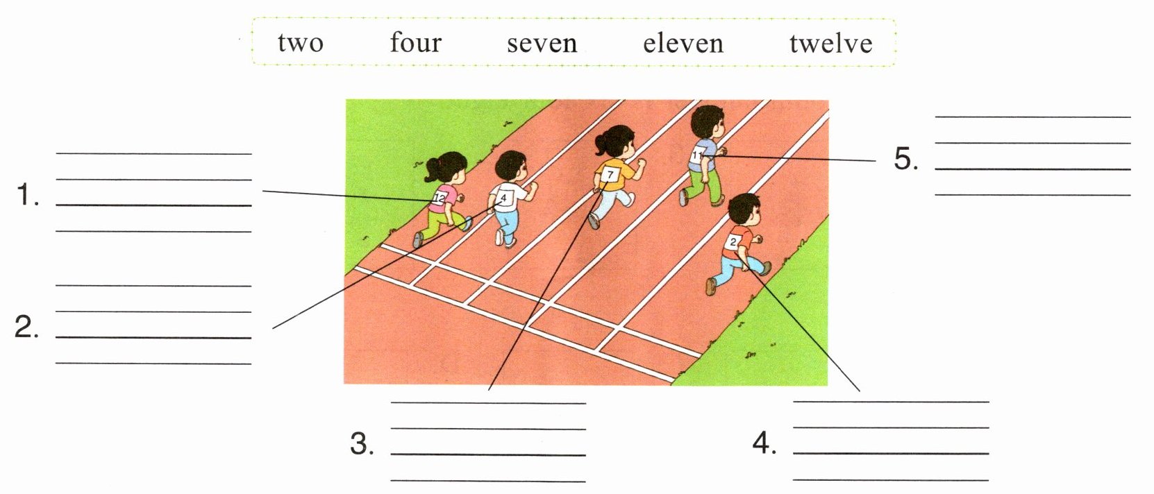 三 看图,选出与运动员号码牌上的数字相符的单词,并写在四线三格内。