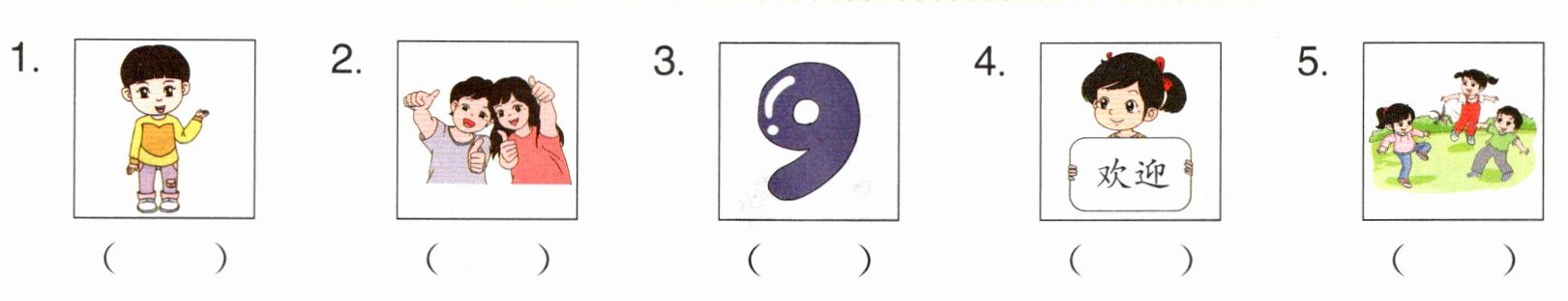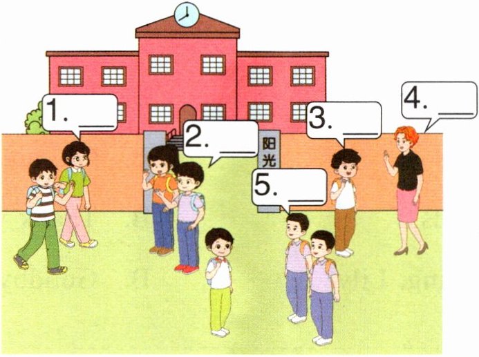 五 新学期开学了,老师和同学们正在校门前互相介绍、问候。看图,选择正确的句子,将序号写在对话框内的横线上。