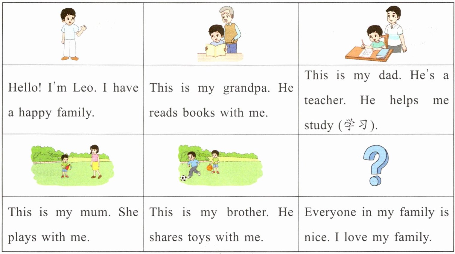 )3. Leo and his brother read books together.任务二:根据故事内容,给“?”处配上合适的图片。(