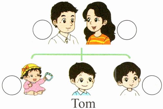 七 选择正确的单词,将序号写在圆圈内,完成家谱图,并判断句子正(√)误(×)。