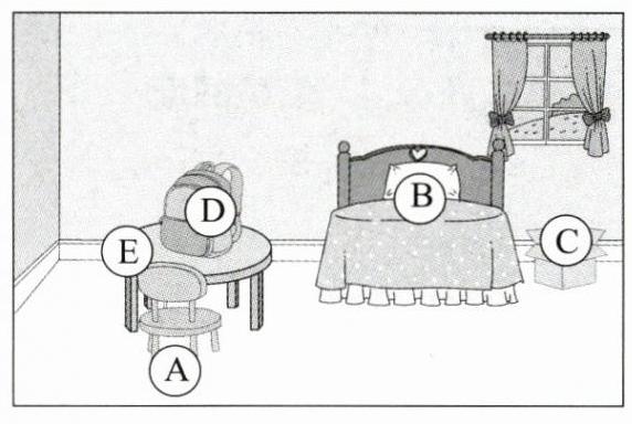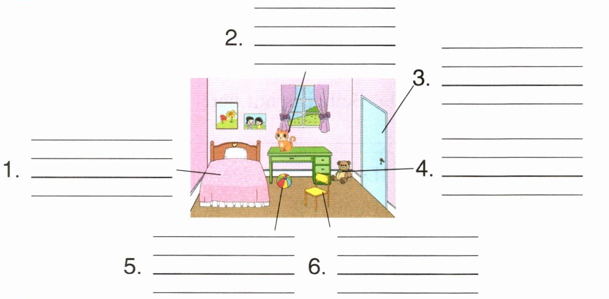 1. bed 2. cat 3. door 4. toy 5. ball 6. chair