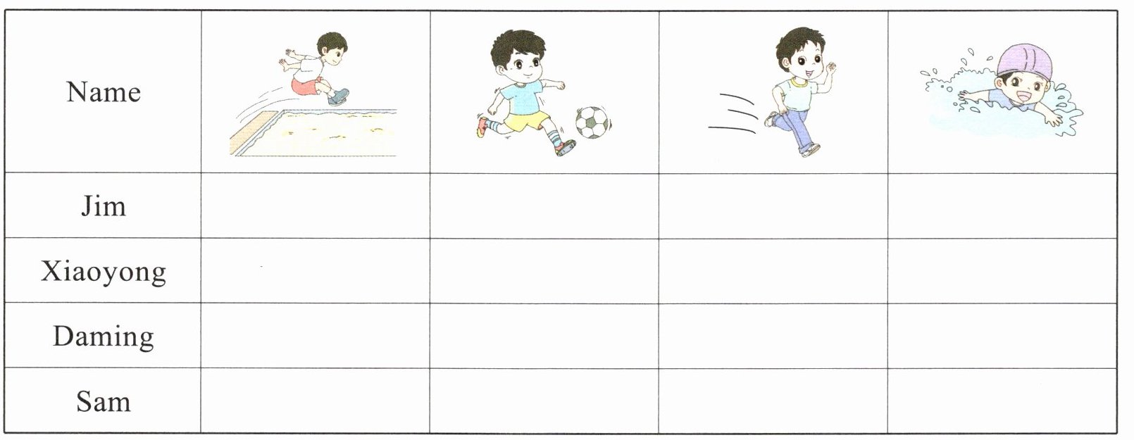 二 听录音,根据所听内容,在人物特长相应的表格内打“√”。