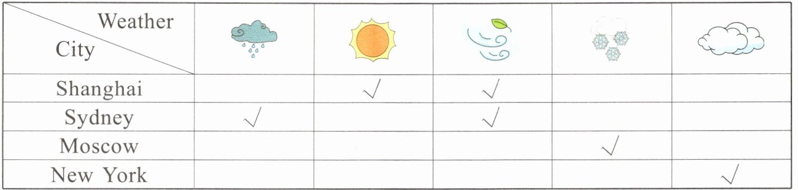 )4. It's cloudy in New York.任务二:根据表格内容或实际情况回答问题。