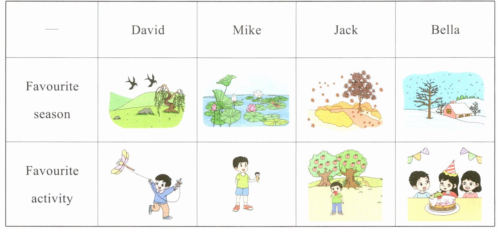 五 情境 四季爱好 根据表格内容,判断句子正(T)误(F)。