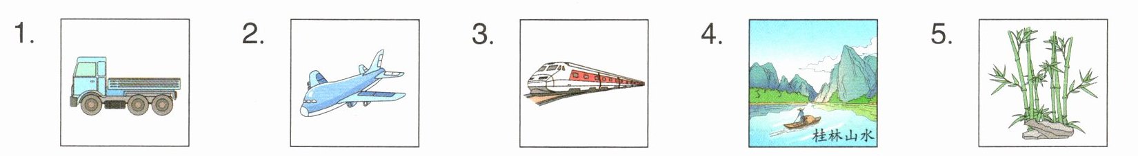 1. away 2. car 3. plane 4. bus 5. bamboo