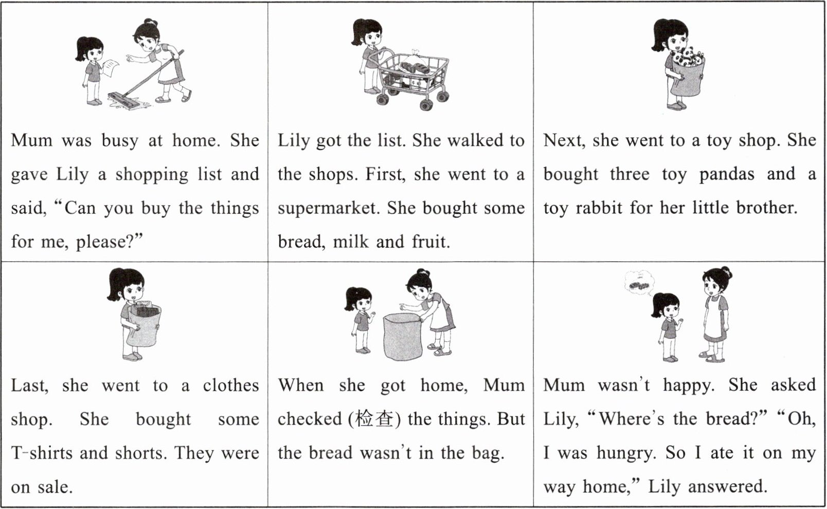When she got home, Mum checked (检查) the things. But the bread wasn’t in the bag.