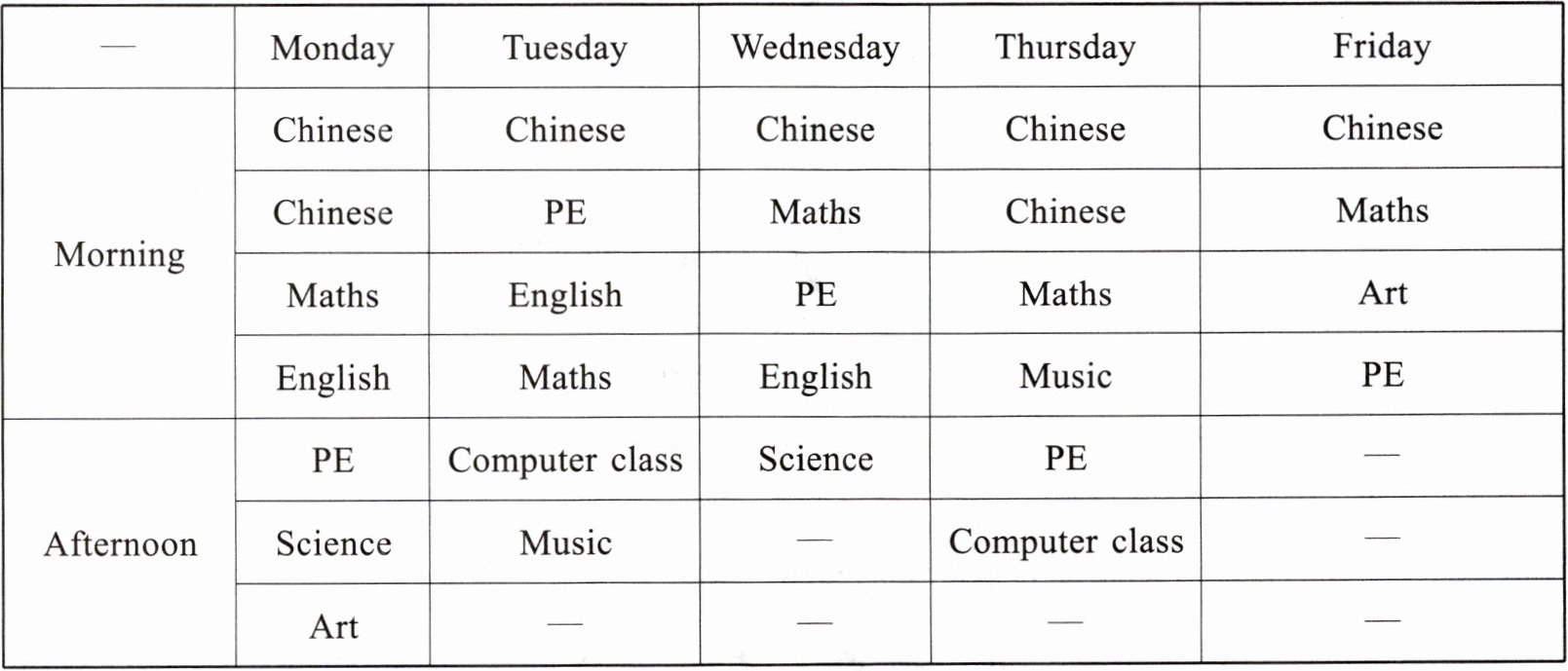 根据课程表内容,回答问题或填空。