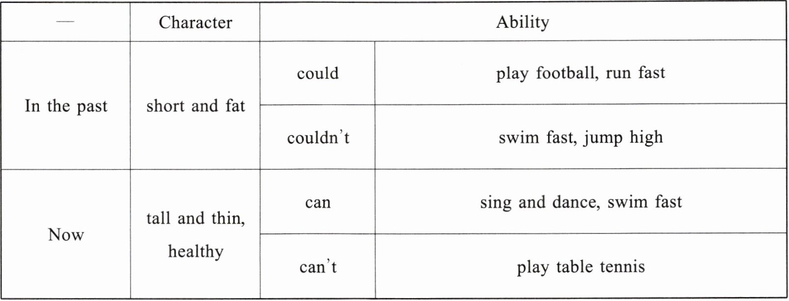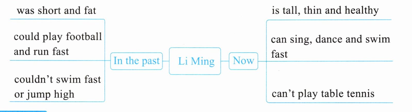Hello, I'm Li Ming. In the past, I was short and fat. I liked playing football. I could play football well. And I could run fast too. But I couldn't swim fast or jump high. Now, I'm tall and thin. I'm healthy. I can sing and dance. I'm good at swimming. I can swim fast. But I can't play table tennis.