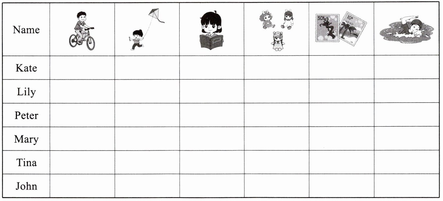 二 听录音,看看大家各自的爱好是什么,在表格中相应的位置打“√”。