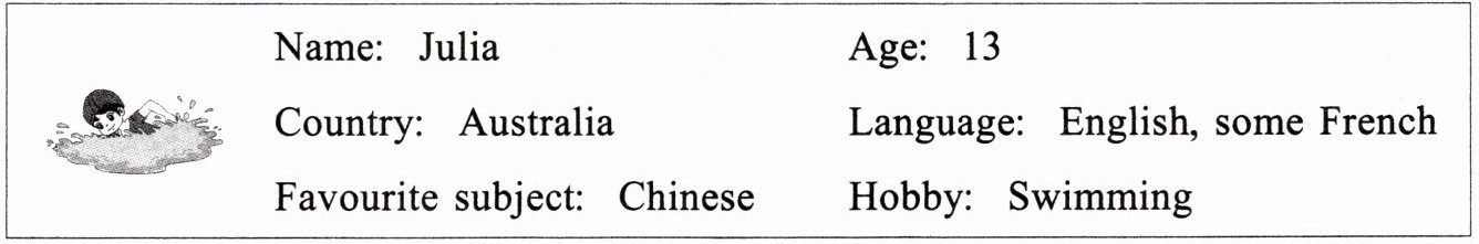 Her name is Julia. She is 13 years old. She is from Australia. She speaks English. And she can speak some French. Her favourite subject is Chinese. She thinks it's very interesting. She likes swimming very much. She can swim very well.