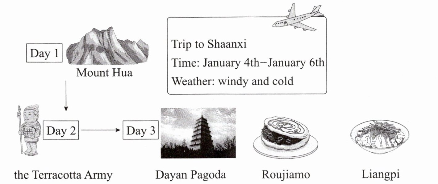 一新情境陕西逸游寒假Amy准备开启陕西之旅,去参观著名的景点,品尝特色的小吃。