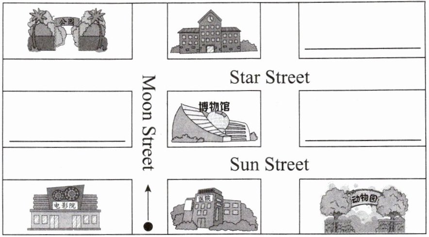五 新题型 看图读对话,在地图相应的位置上写出地点名称。