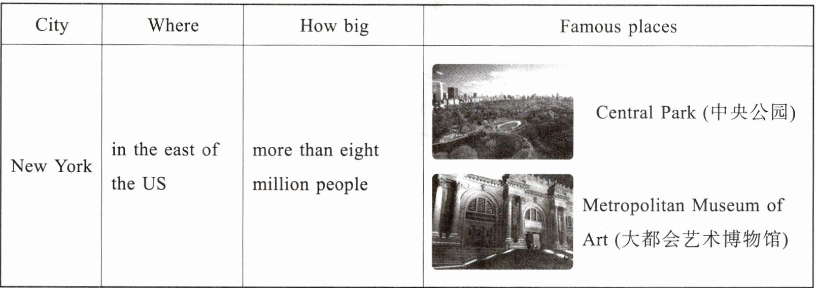 “未来能源”主题活动致力于探索未来能源发展趋势。2024 年的“未来能源”主题活动在美国纽约举行。请你根据表格内容,用英语介绍一下纽约。