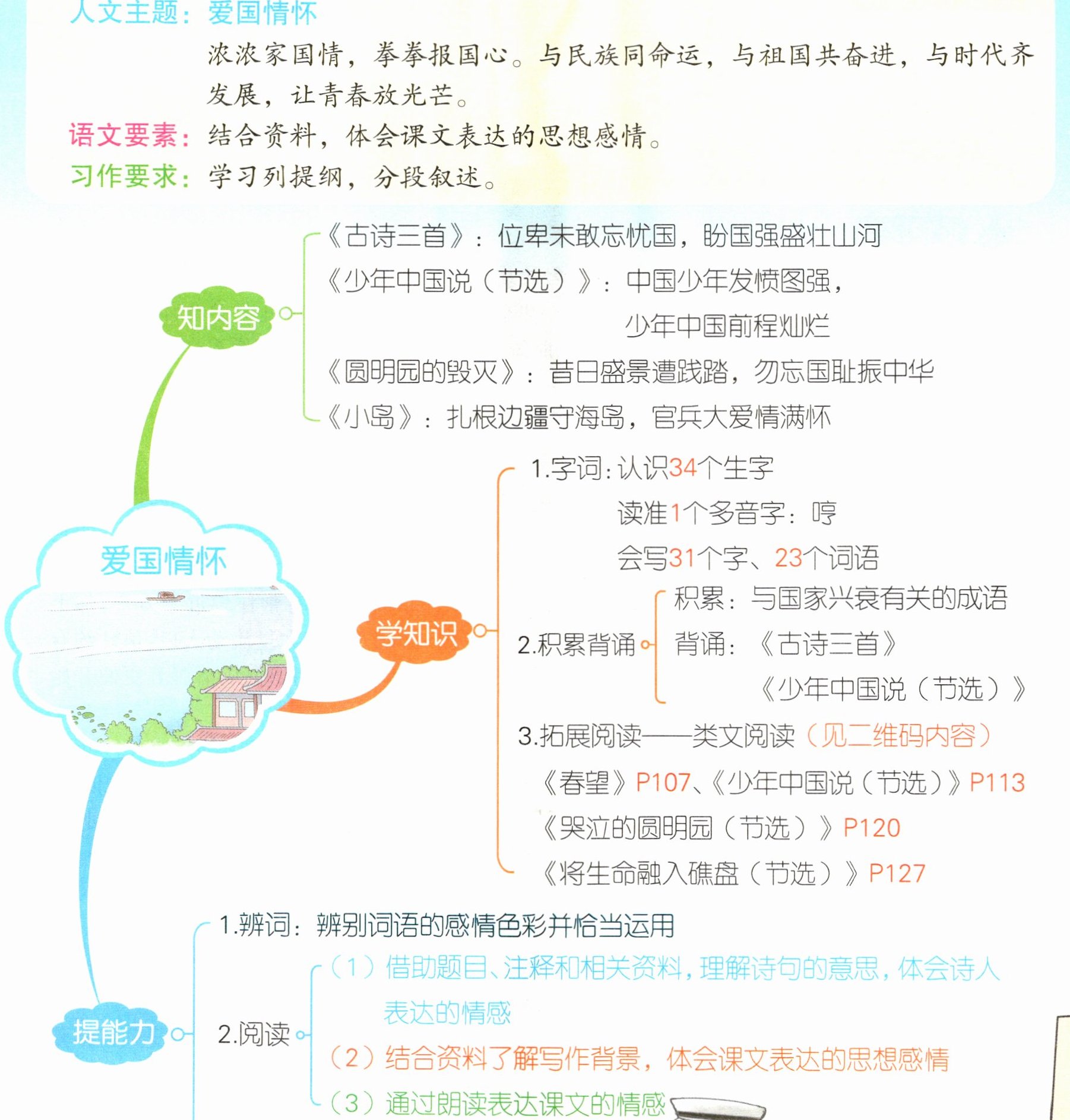 3. 拓展阅读:类文阅读《春望》P107、《少年中国说(节选)》P113、《哭泣的圆明园(节选)》P120、《将生命融入礁盘(节选)》P127。