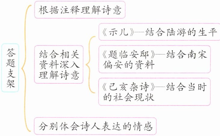 提示:①三首古诗的感情基调略有不同,要在理解诗意、体会情感的基础上准确把握并读出来。如,《示儿》中“但悲不见九州同”的沉郁和对收复失地的渴望;《题临安邸》中对统治者苟且偷安的悲愤;《己亥杂诗》中诗人对“万马齐喑”的痛心疾首和对社会变革的热烈期盼。要读出诗歌的不同情感和音韵美。②可借助关键词背诵古诗,如《示儿》中的“空、悲、北定、家祭”;《题临安邸》中的“山、楼、歌舞、熏、醉、直把”;《己亥杂诗》中的“九州、万马、劝、降”。③默写《示儿》的时候,注意“元”“州”“乃”等字不要写错了。
