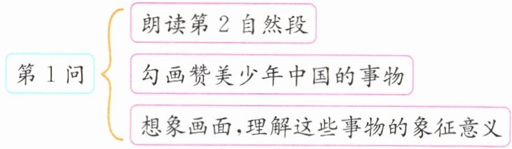 提示:①在理解文意的基础上读正确、流利,结合文意和时代背景准确把握课文的感情基调。如,第1自然段借助“少年……则国……9 这个句式读好句子的停顿和节奏。关键字词和短语要读得重一些,如“智、富、强、独立、自由、进步、胜于欧洲、雄于地球”。整段朗读时语调可逐渐拔高,读出气势。第2自然段要一边读一边想象画面,读出少年中国的蓬勃朝气。第3自然段要读得高亢,充满力量。②在理解文意、了解作者写作思路的基础上背诵,在背诵的过程中加深理解,体会情感。